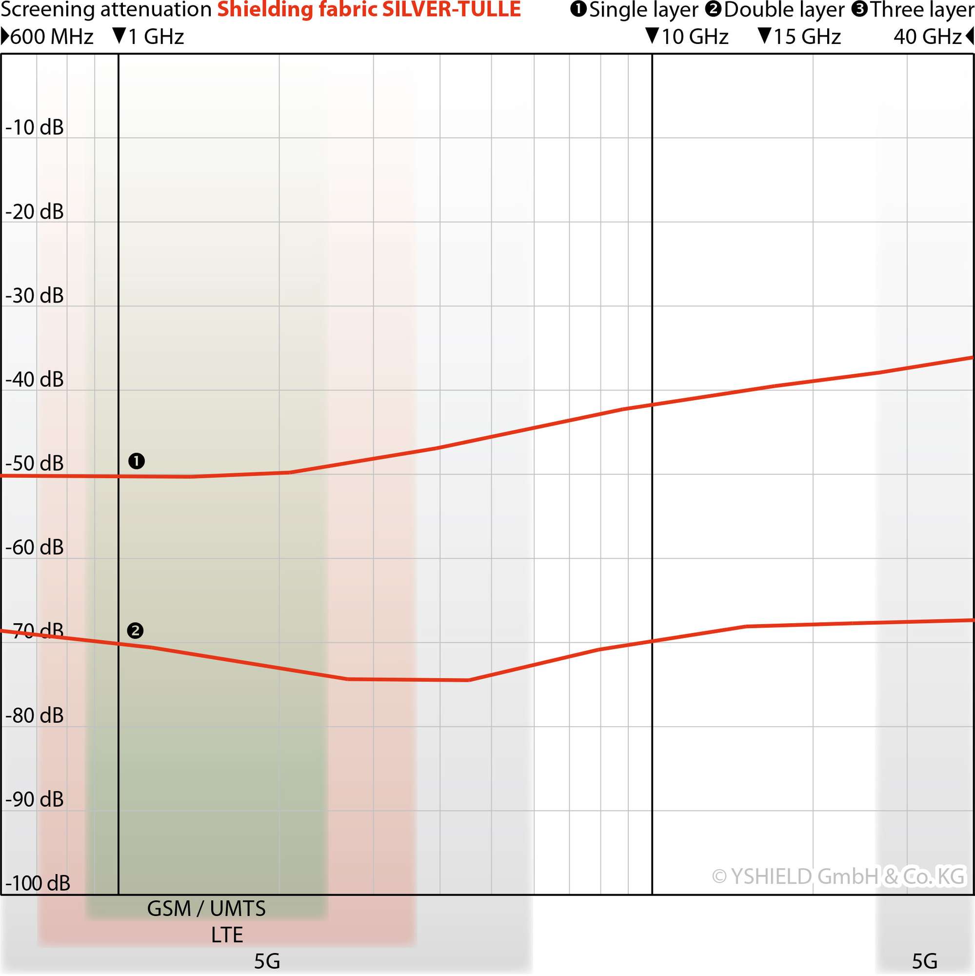 - This product shields high frequency electromagnetic fields (HF). The indicated dB-values apply to 1 GHz, view chart for other frequencies. Expert reports ranging from 40/600 MHz to 40 GHz according to standards ASTM D4935-10 or IEEE Std 299-2006, view report below.